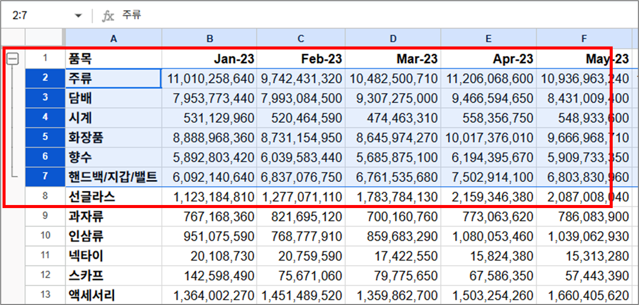 4-1 그룹을 하고 싶은 행을 블록 설정합니다.