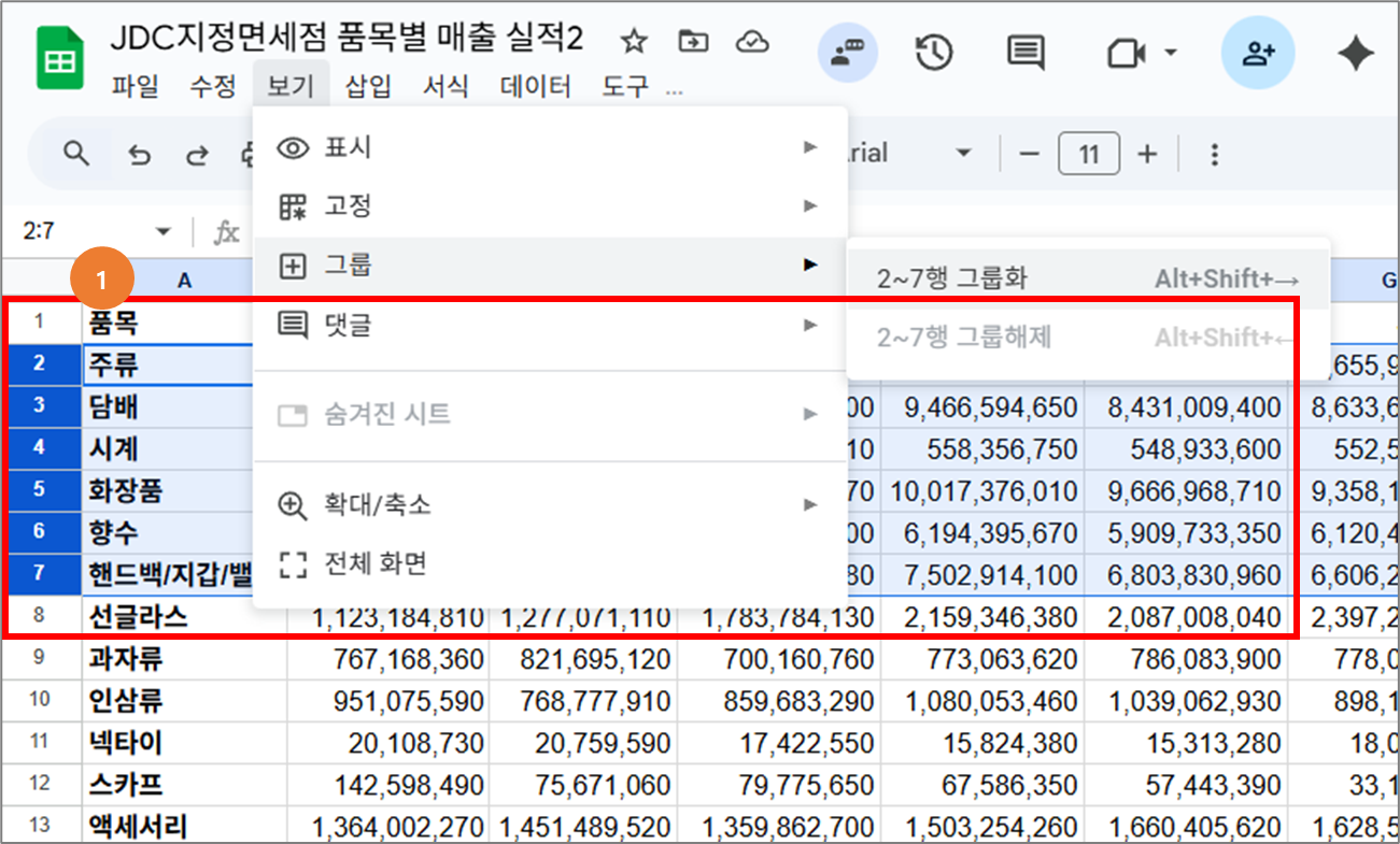 - 예시: 2~7행에 매출 데이터를 넣고 그룹으로 묶으면, - 버튼 하나로 전체를 접거나 펼칠 수 있습니다.