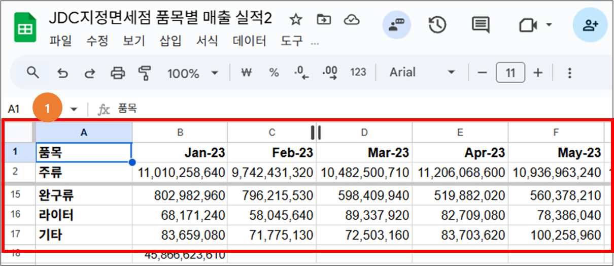 - 예시: 행 1개를 고정 하면, 아래로 아무리 내려도 1행은 계속 보입니다.