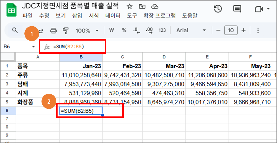 2번 B6셀에 "=SUM(B2:B5)" 입력된 것을 확인 할 수 있습니다.