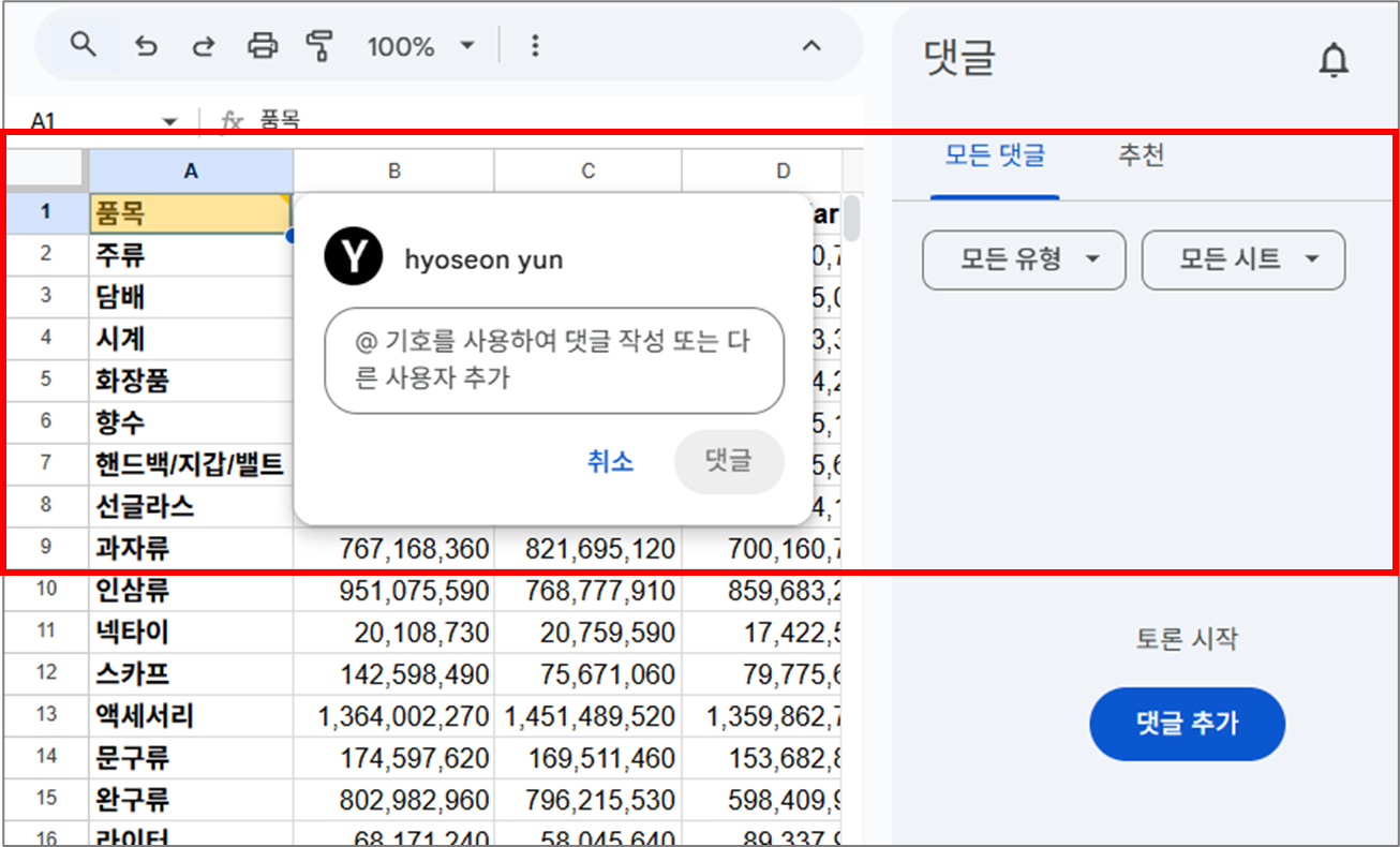 - 활용: 협업 중 의견 전달, 데이터 확인 요청, 업무 지시사항 기록 등에 유용합니다. 보기 메뉴에서 댓글 표시 여부를 조절할 수 있습니다.