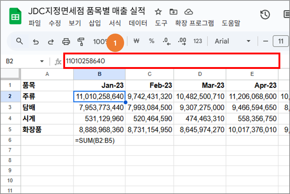 1번 수식바에 보시면 수식이 입력되어 있는 것을 확인 할 수 있습니다.
