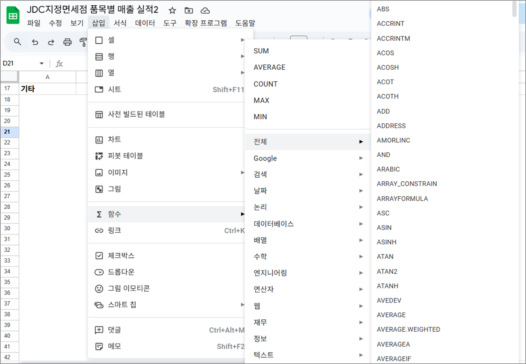 스프레드시트에서 많이 쓰이는 기능이 바로 계산과 자동화입니다. 삽입 메뉴에서는 함수, 링크 같은 편리한 도구도 추가할 수 있습니다.