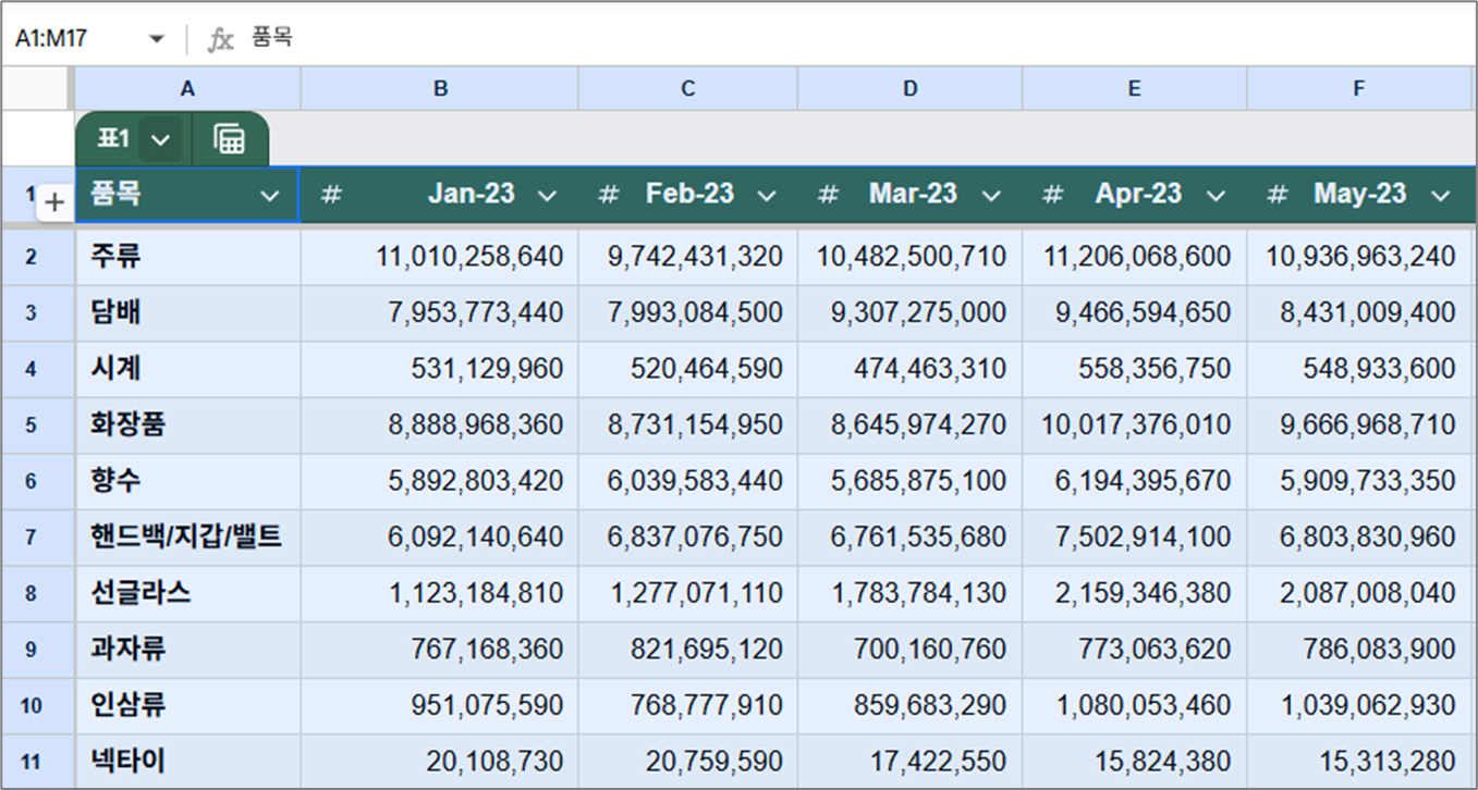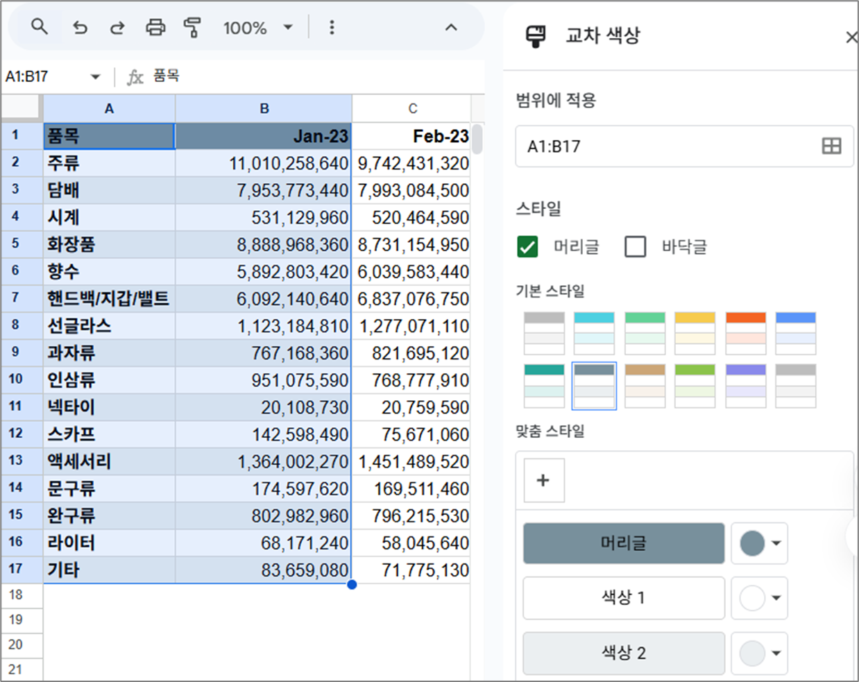 테마는 스프레드시트 전체에 일괄적으로 색상과 글꼴 스타일을 적용하는 기능입니다.