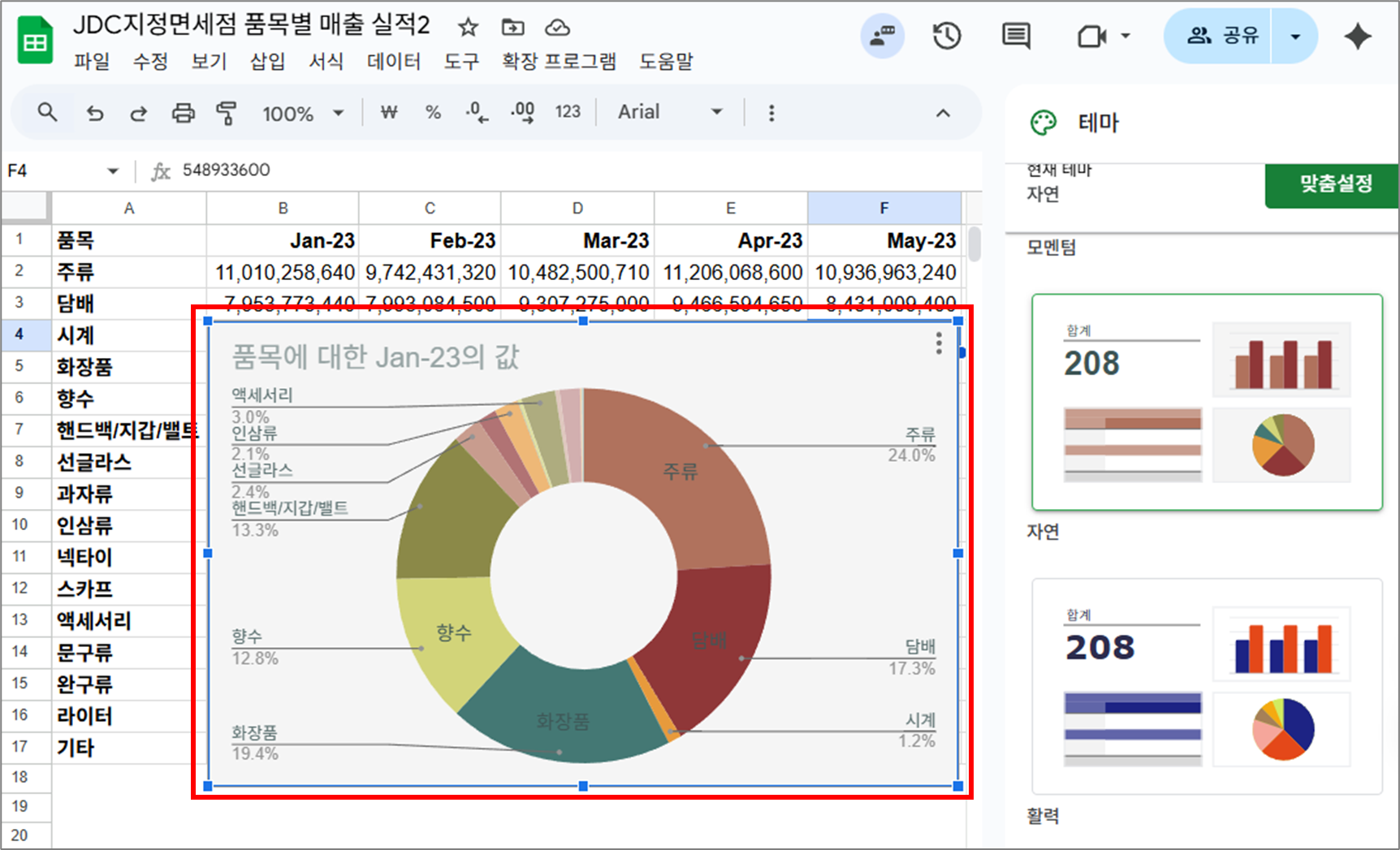 - 예: 1월을 원형 차트로 만들었고, "모멘텀"을 선택하면 표 전체가 깔끔하고 정돈된 색상으로 바뀝니다.