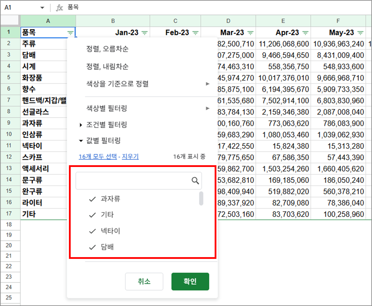 - 활용 예시: 품목에서 원하는 품목 매출 내역만 보고 싶을 때 필터를 설정해 조건에 맞는 데이터만 표시합니다.
