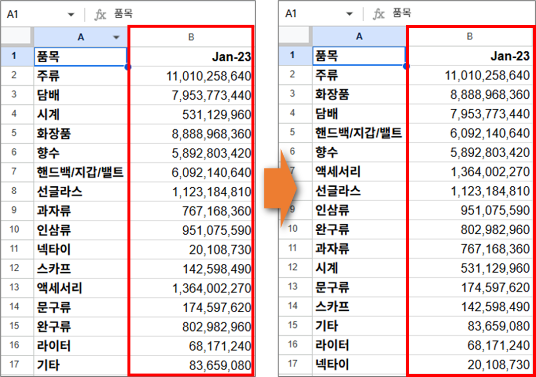 - 활용 예시: 고객 이름순으로 정렬, 매출 데이터를 금액 큰 순서대로(내림차순) 정렬할 때 사용합니다.