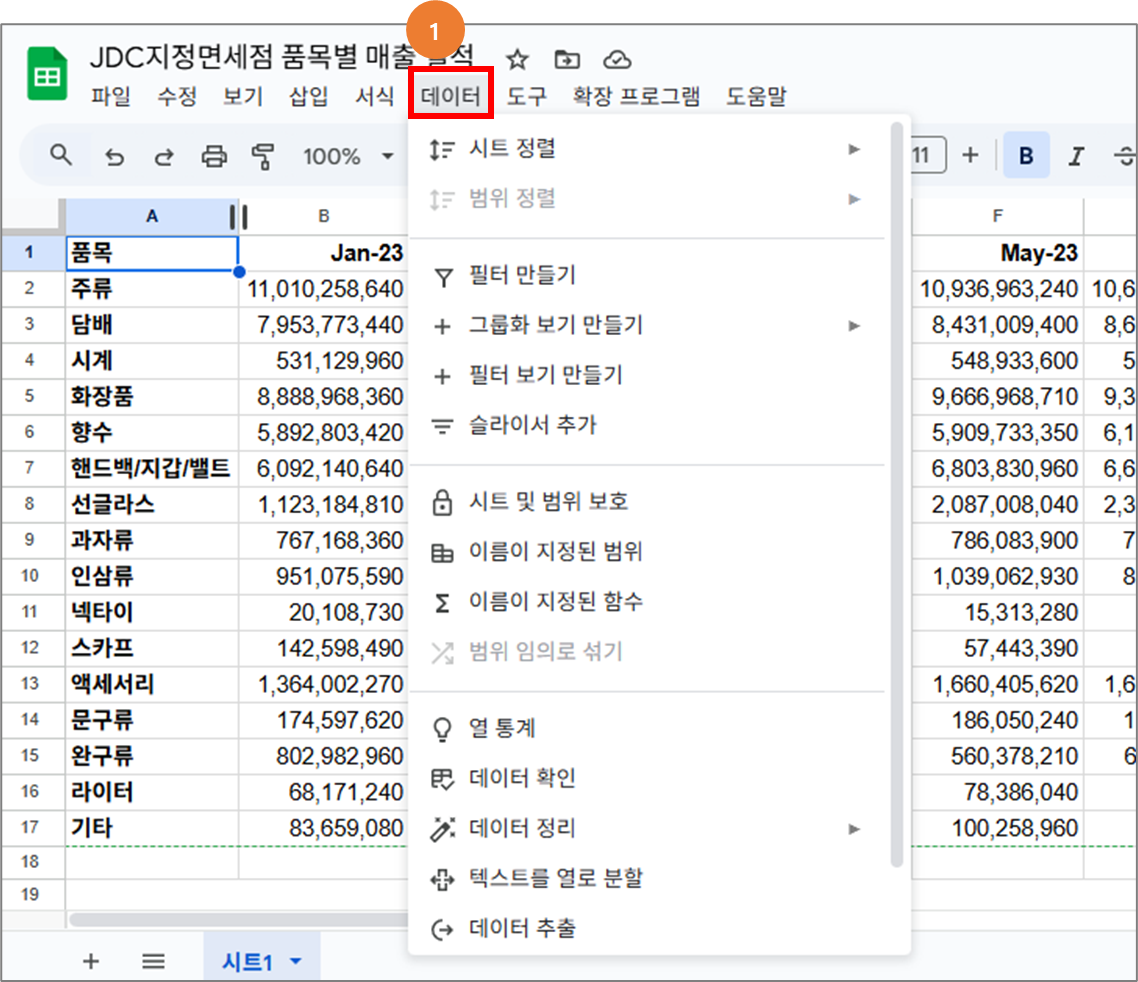 구글 스프레드시트 상단 메뉴 여섯번째 시간 "데이터" 메뉴를 소개해 드리겠습니다.