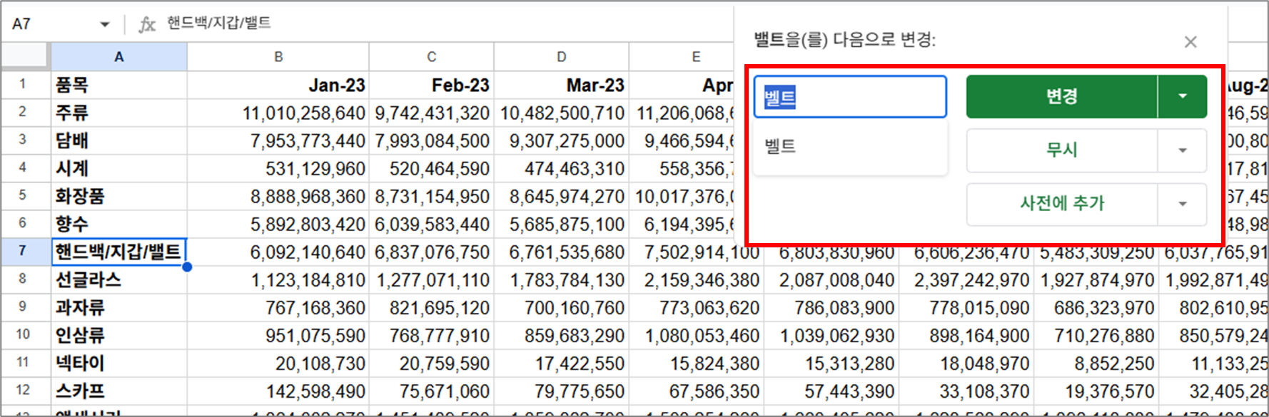 "맞춤법 검사"는 스프레드시트 안의 텍스트(글자)에서 잘못된 철자를 찾아 고쳐주는 기능입니다.