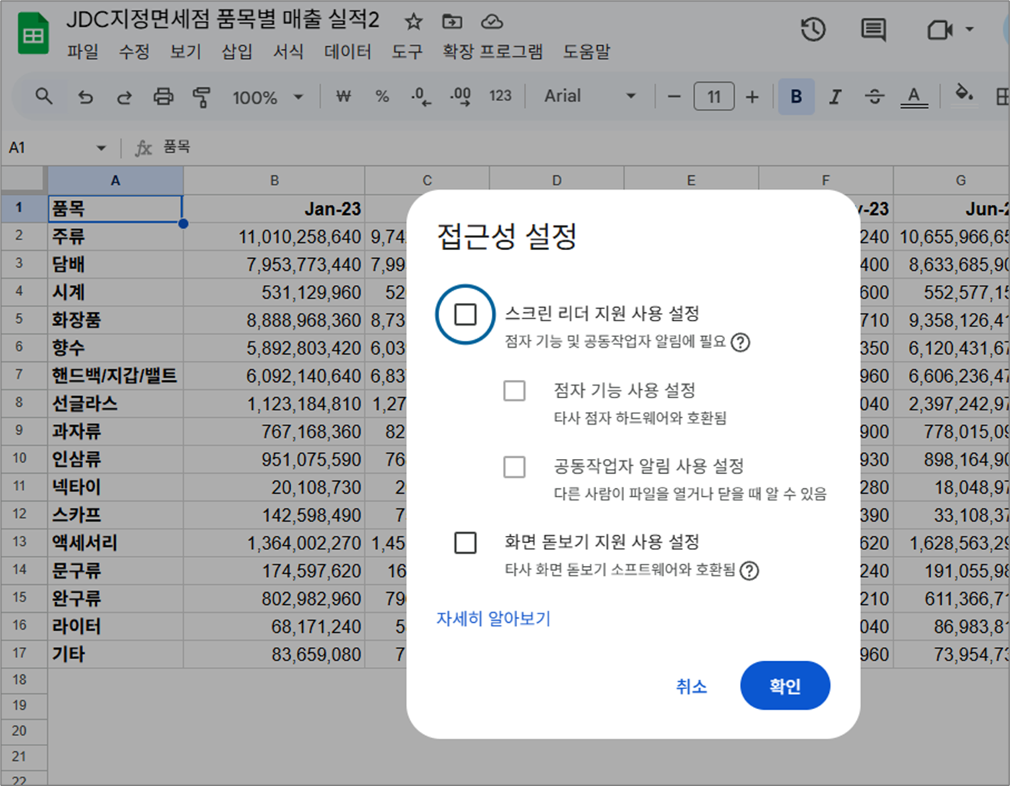 "접근성’(Accessibility)"은 시각적 제약이 있는 사용자도 시트를 쉽게 사용할 수 있도록 돕는 메뉴입니다.