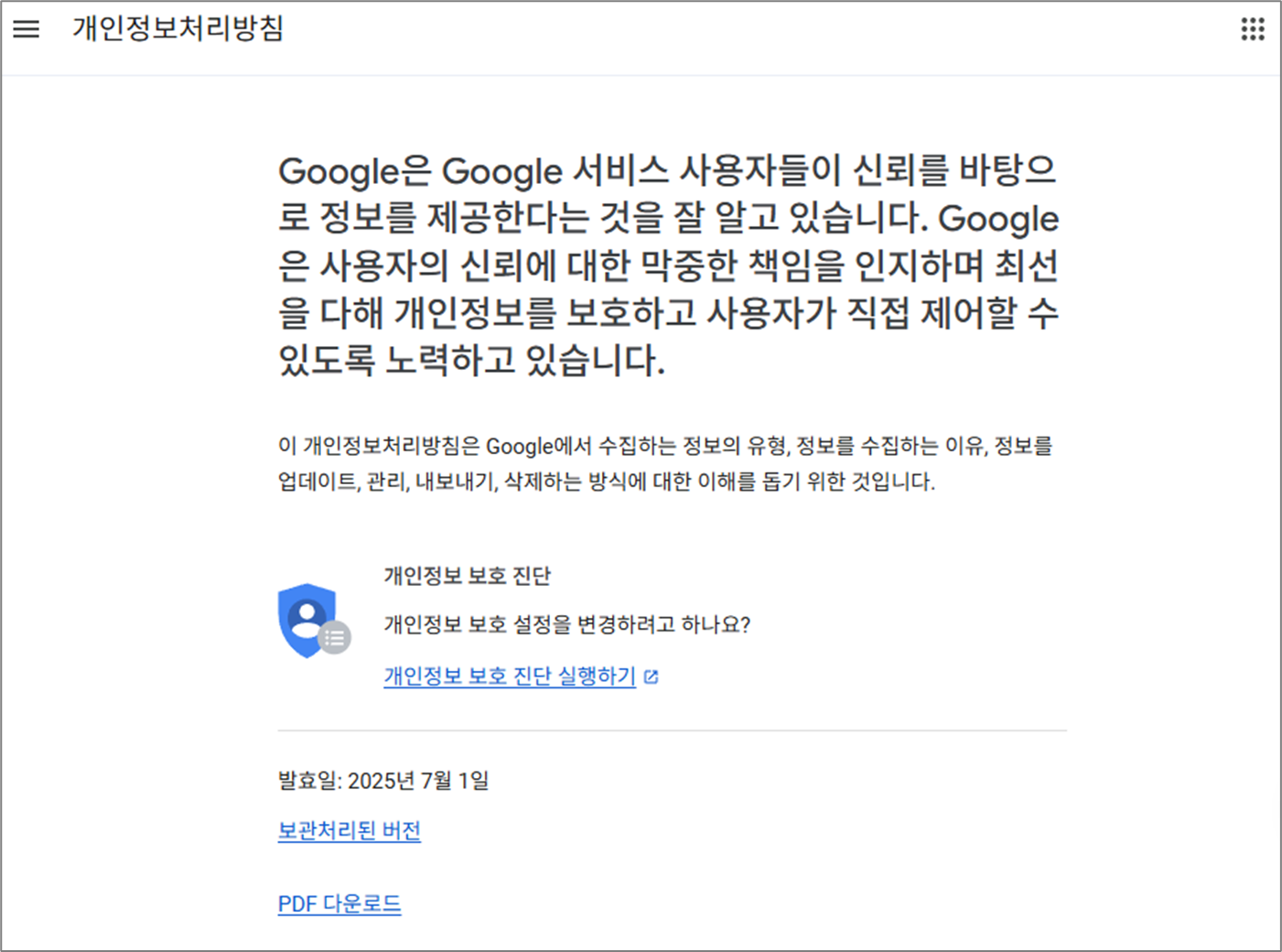 구글이 사용자의 개인정보를 어떻게 수집하고, 저장하고, 보호하는지를 명시한 공식 문서로 연결됩니다.