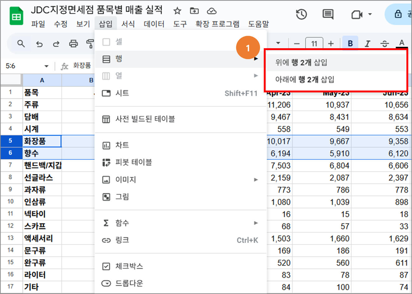예를 들어, 위 사진처럼 행 2개를 선택한 상태에서 삽입을 진행하면 메뉴에 “행 2개 삽입”이라는 옵션이 자동으로 표시됩니다.