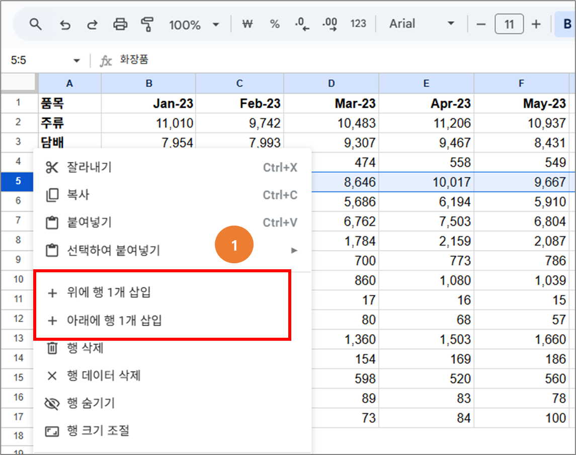 - 마우스 오른쪽 클릭 → 위에 행 삽입 또는 아래에 행 삽입을 선택합니다.