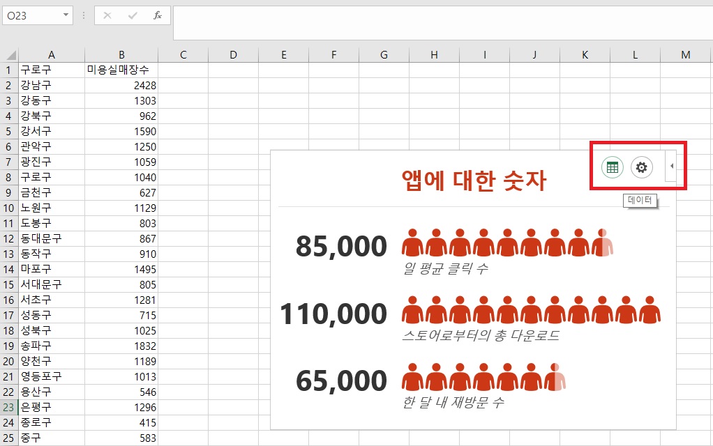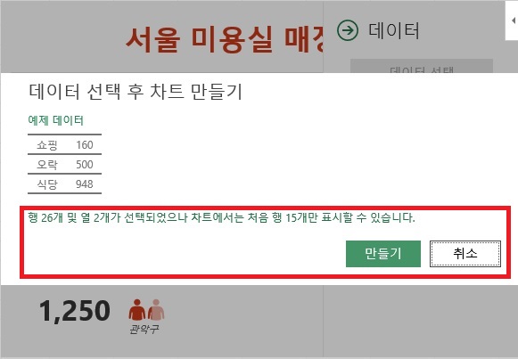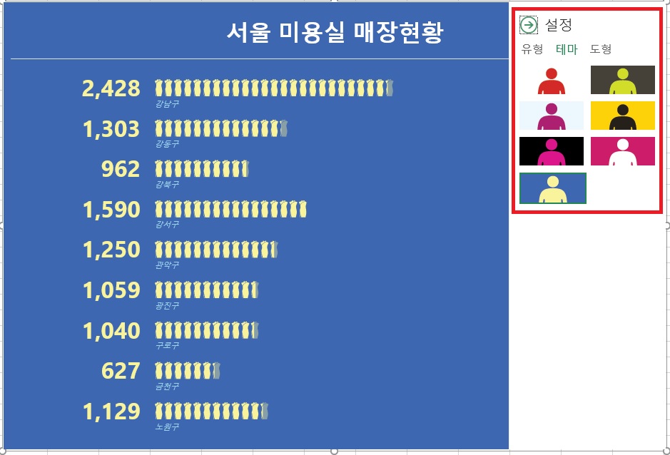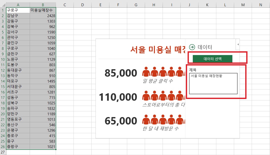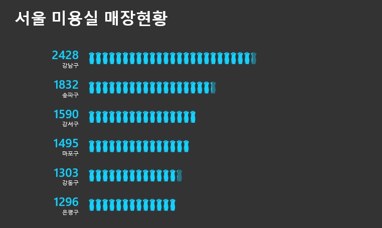 아래 사진은 엑셀로 서울에 운영 중인 미용실 매장 수 구단위로 그래픽으로 만든 것입니다.