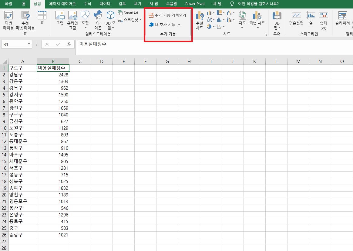 1. 엑셀 삽입에 추가 기능 가져오기 클릭합니다.