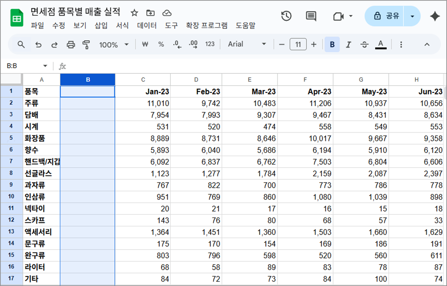 2. B열에 새 열을 삽입해보겠습니다.