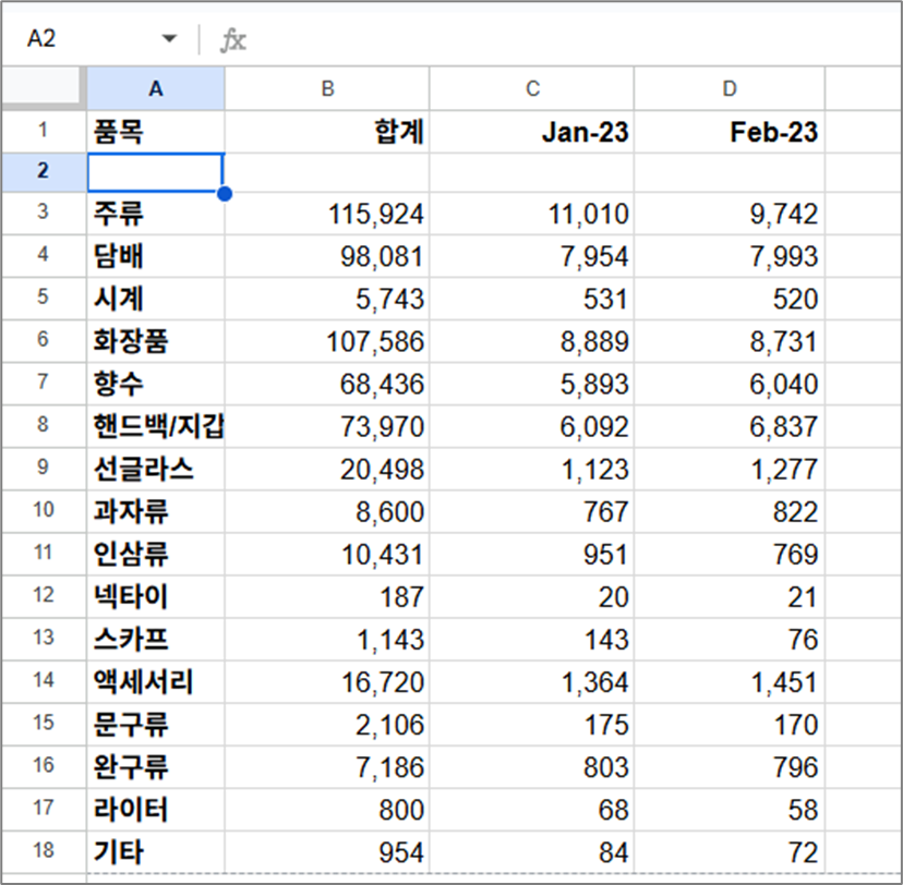아래 그림 1의 시트에서 B열에 새 열을 추가해 합계를 계산하고, 2행에도 새 행을 삽입해 합계를 구해 보겠습니다.