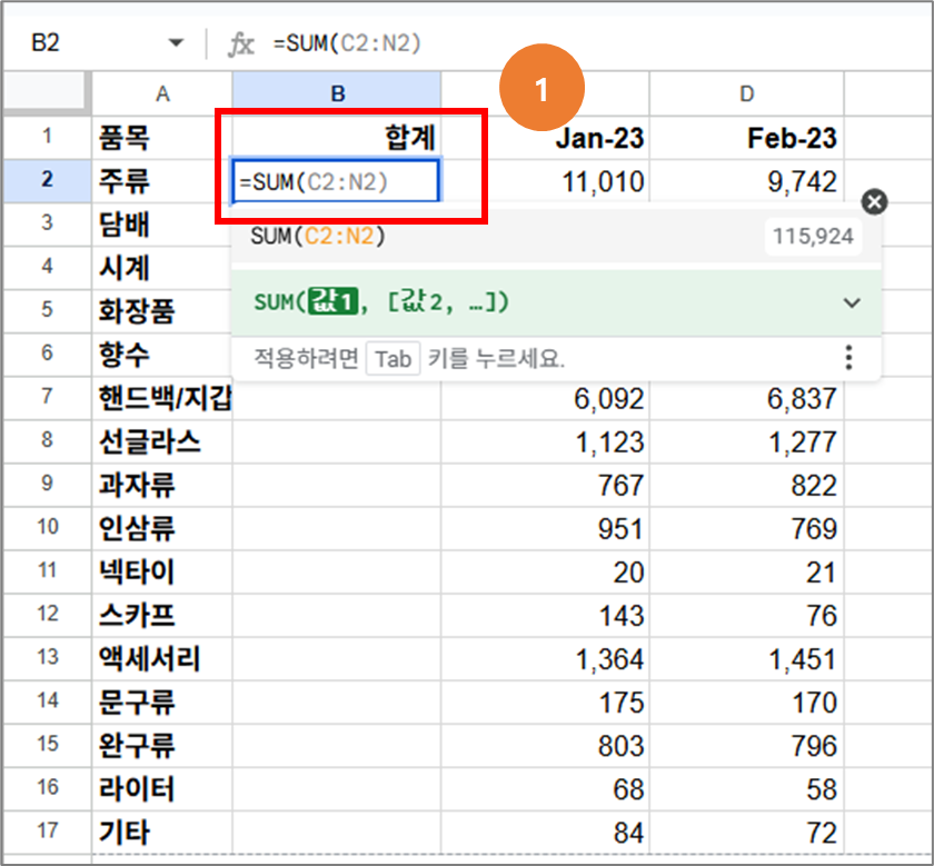 셀 B2에 =SUM(C2:N2) 를 입력하면, 오른쪽에 있는 C2부터 N2까지의 모든 셀 합계가 자동으로 계산되어 표시됩니다.