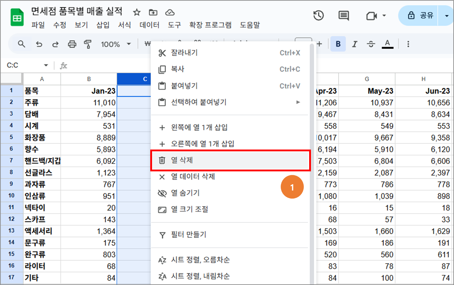 - 마우스 오른쪽 클릭 -> "열 삭제"를 선택 _ 방금 삽입된 열이 바로 삭제됩니다.