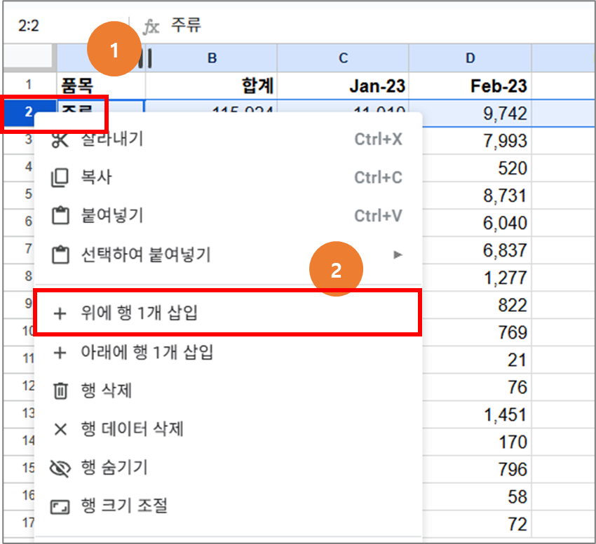 2-1 그림5에 표시한 1번과 같이 2행 선택 > 2번 위에 행 1개 삽입 선택 합니다.