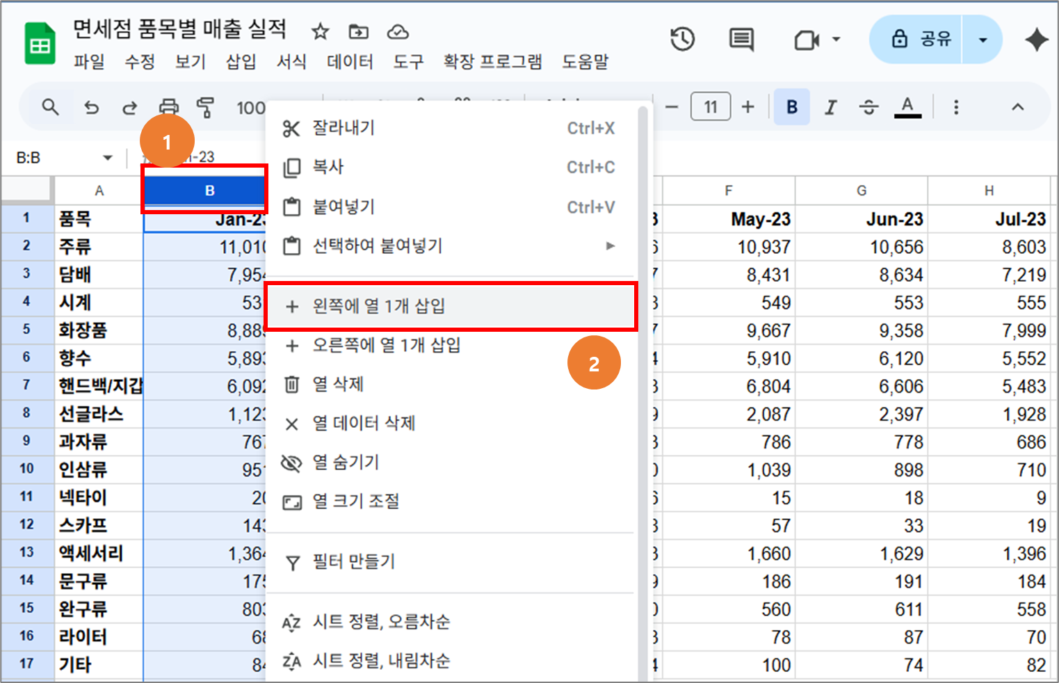 1-1 그림2에 표시한 1번과 같이 B열 선택 > 2번 왼쪽에 열 1개 삽입 선택 합니다.