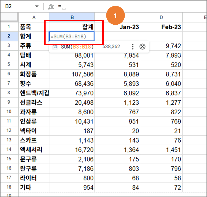 셀 B2에 =SUM(B3:B18) 를 입력하면, 아래쪽에 있는 B3부터 B18까지의 모든 셀 합계가 자동으로 계산되어 표시됩니다.