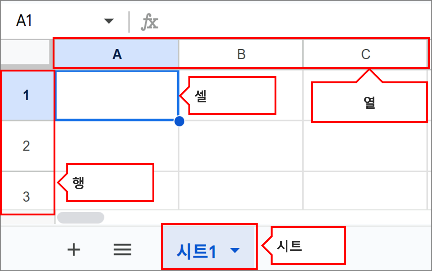 - 문서(Spreadsheet File) 는 여러 시트가 모인 하나의 전체 파일입니다.