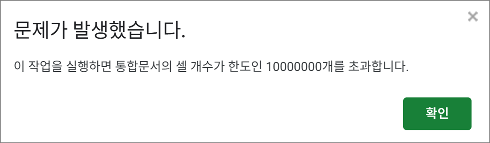 그리고 셀은 최대 1000만 셀을 지원합니다. 1000만 셀을 넘으면 그림 5번처럼 안내 창이 나옵니다.