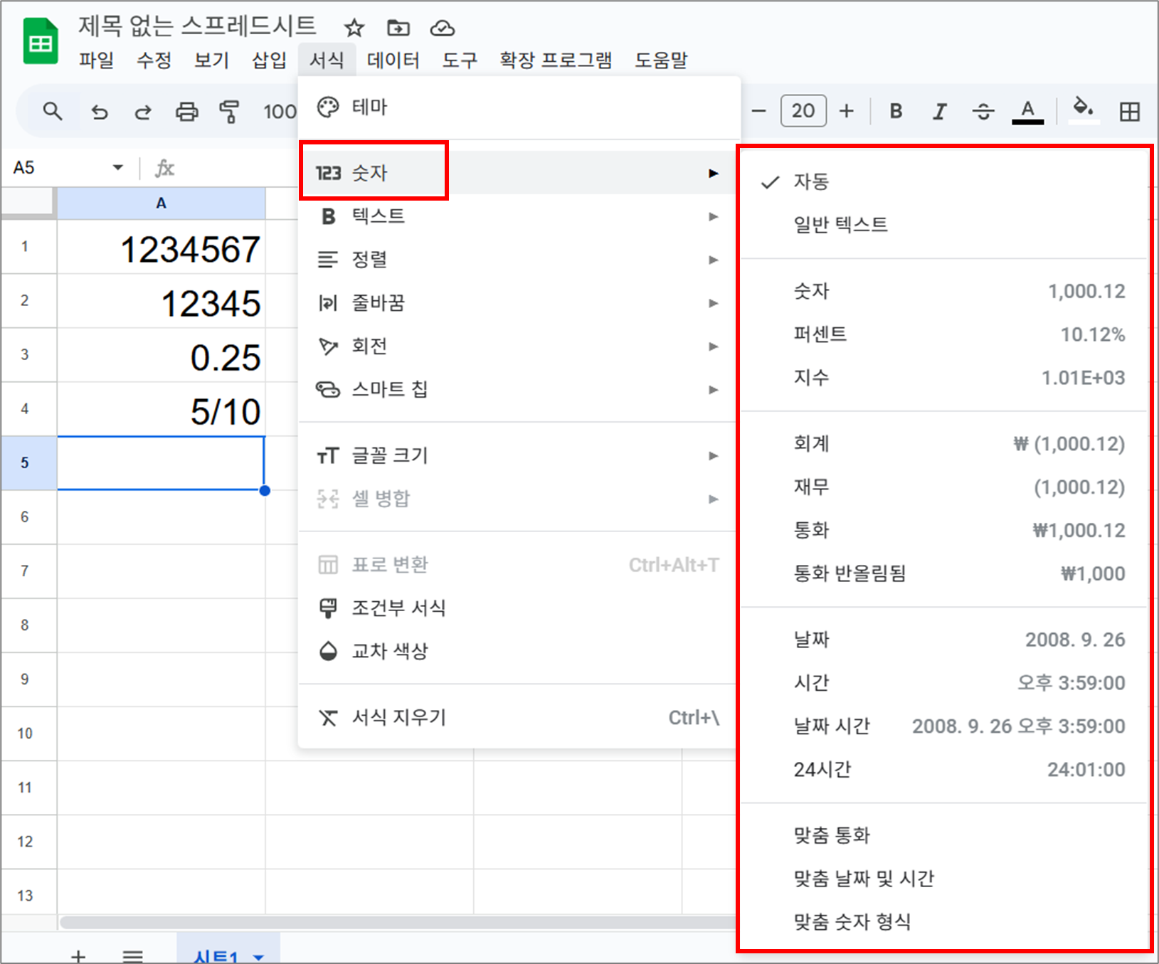 "엑셀 > 셀 서식 > 표시 형식"과 구글 스프레드시트와 동일한 것은 "숫자"입니다