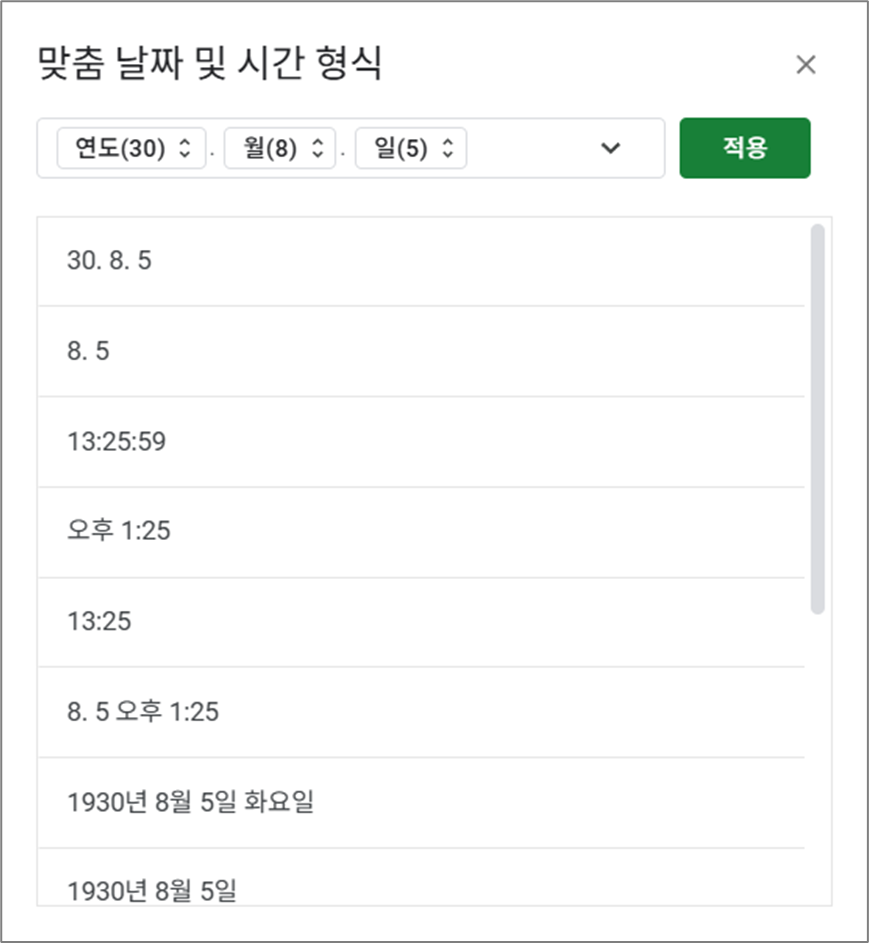 - 셀에 2025-10-18을 입력했을 때 → “2025년 10월 18일”로 보이게 할 수 있고