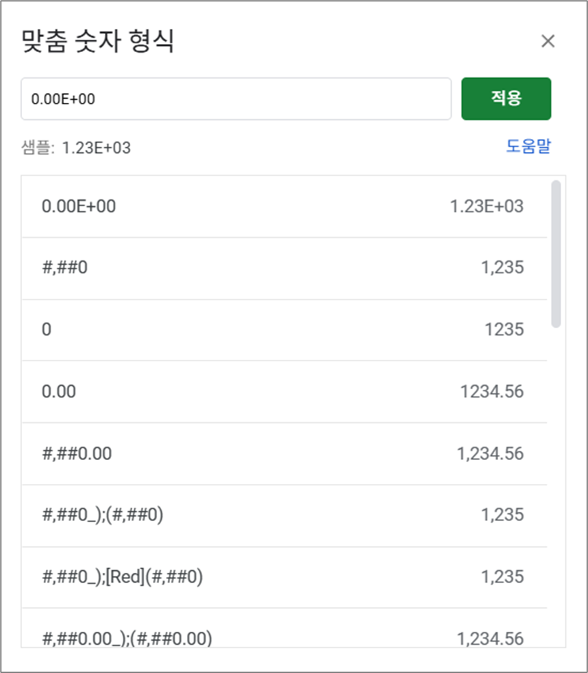 상단 메뉴 : 서식 → 숫자 → 맞춤 숫자 형식