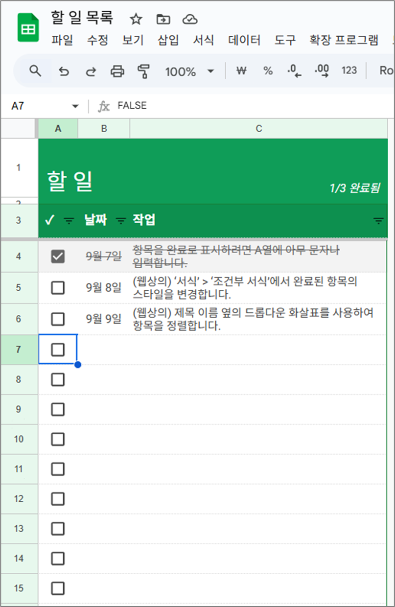 협업시 체크박스를 통해서 완료 여부를 한눈에 볼 수 있는 탬플릿입니다.