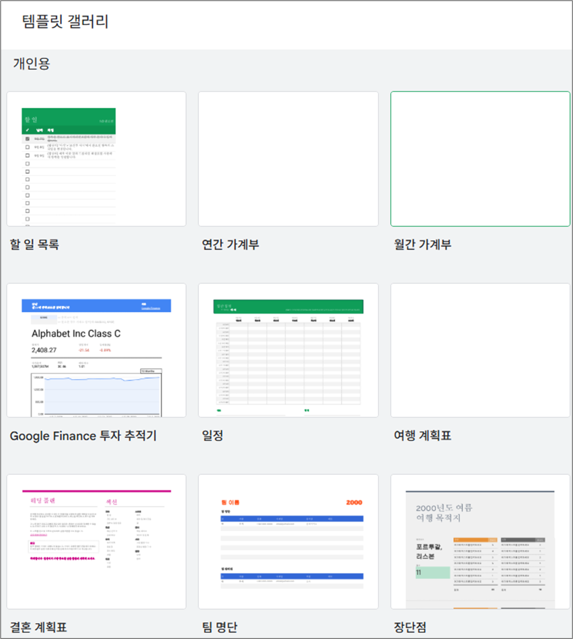 | 개인용 | 할 일 목록, 연간 가계부, 월간 가계부, Google Finance 투자 추적기, 일정 |