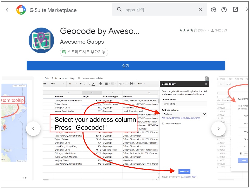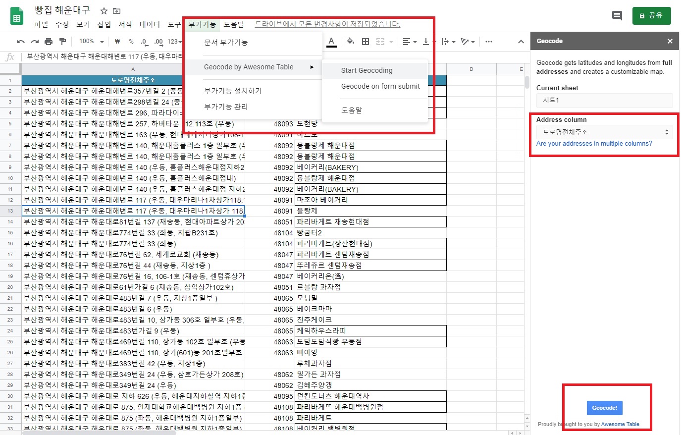 Geocode by Awesome Table → Start Geocoding 클릭해주세요