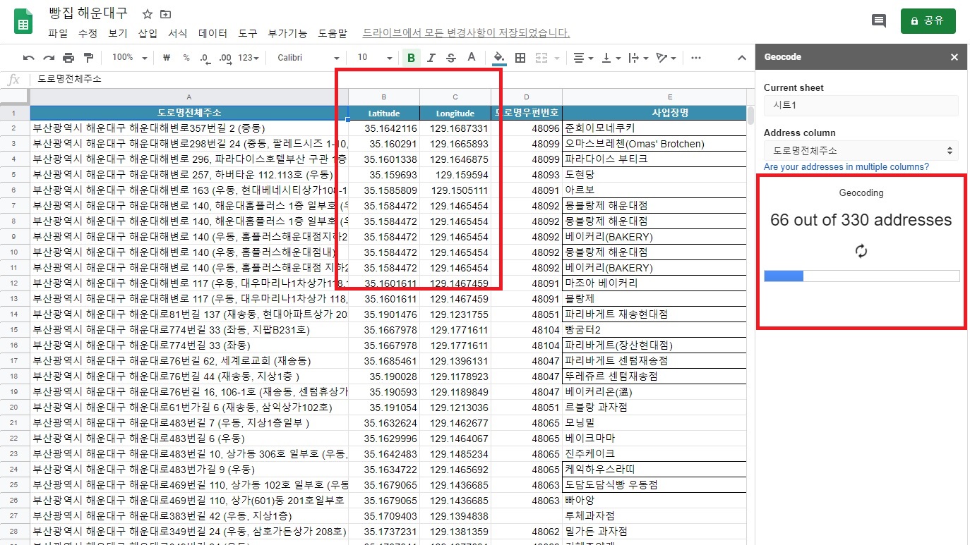 7. 위에 Geocode 클릭하면 아래 화면처럼 위도 경도가 삽입되면서 자동 변경됩니다