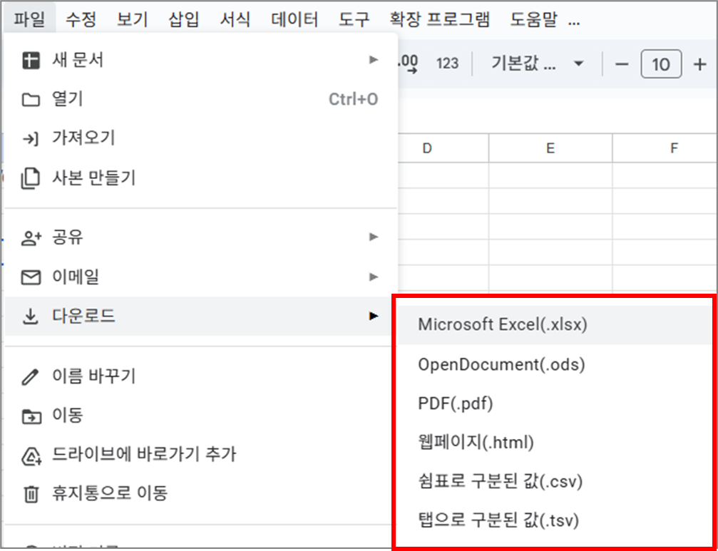 스프레드시트를 다른 형식의 파일로 저장(내보내기) 하는 기능입니다.