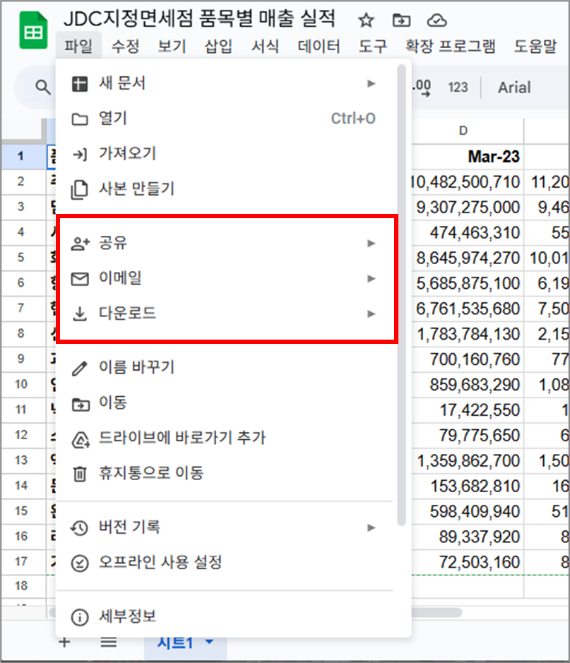 구글 스프레드시트의 '파일' 메뉴 2탄 _ ‘공유’, ‘이메일’, ‘다운로드’ 기능