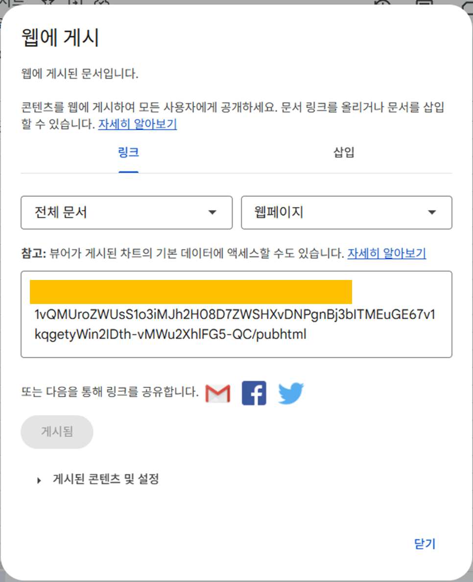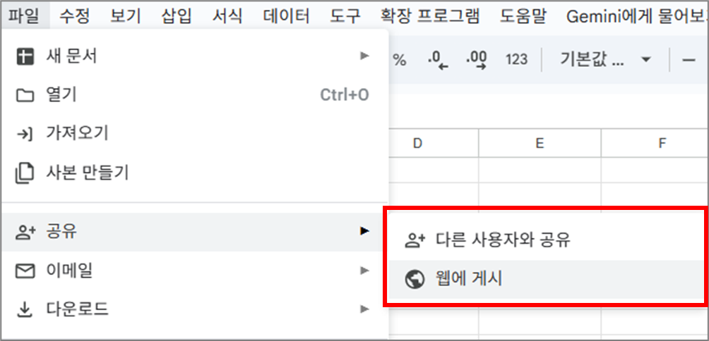 - 상단 메뉴에서 파일 → 공유 → 웹에 게시 클릭
