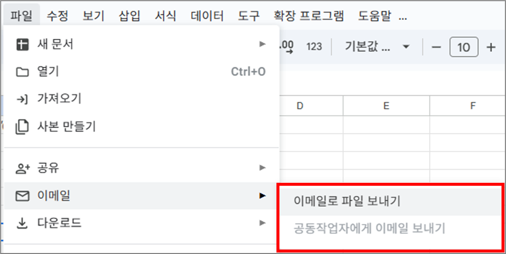 이 메뉴는 스프레드시트의 내용을 이메일로 바로 보낼 수 있도록 도와줍니다.