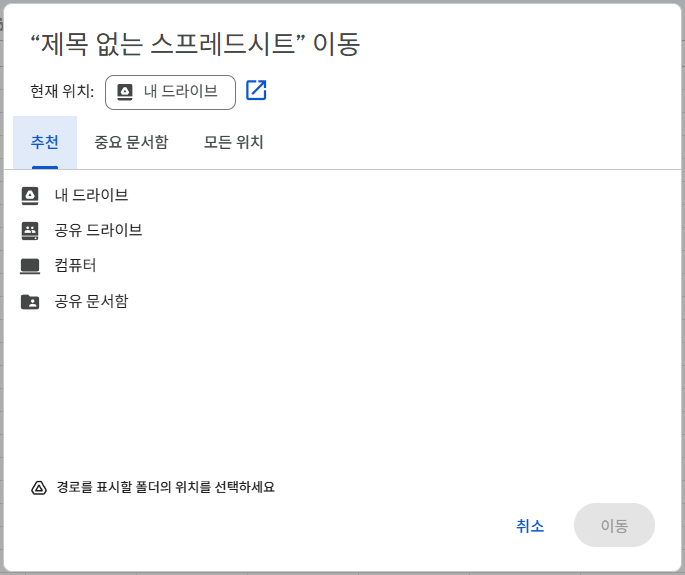 현재 문서를 Google Drive 폴더로 이동하거나 새 탭에서 열기로 문서를 정리할 수 있는 기능입니다.