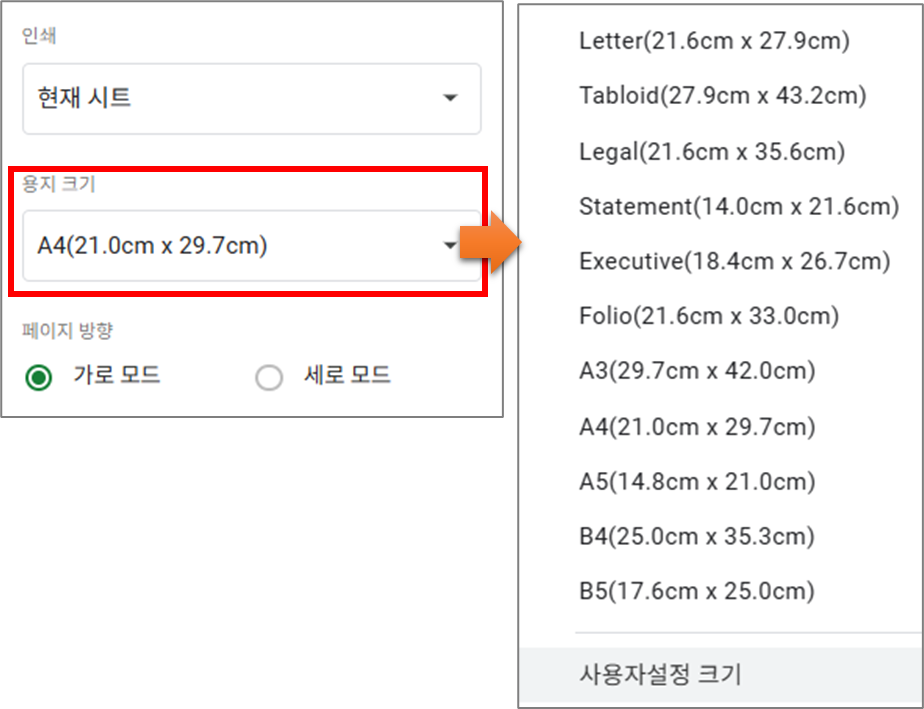 - 문서가 세로로 출력될지, 가로로 출력될지 정합니다.