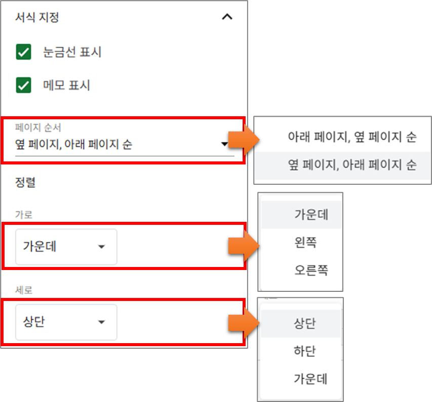 - 인쇄할 때 시트의 표시 요소를 설정합니다.
