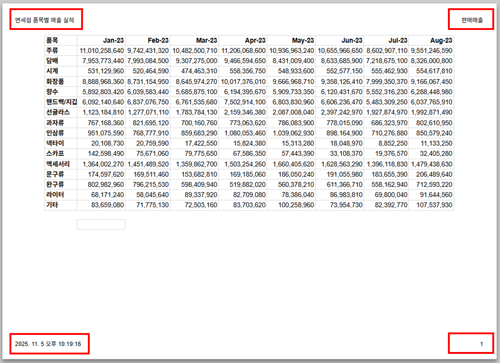 - 출력물의 상단(머리글)과 하단(바닥글)에 정보를 자동 표시합니다.