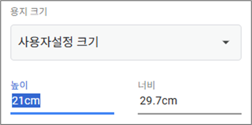 원하는 용지가 없으면 "사용자설정 크기'선택하여 높이와 너비에 원하는 크기를 입력합니다.
