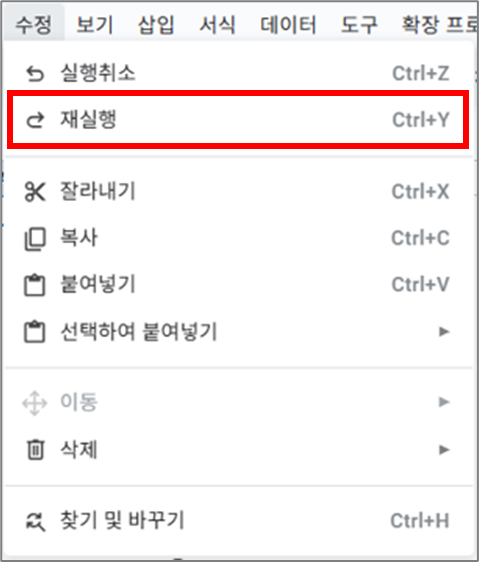 - 메뉴에서 수정 → 재실행을 클릭하거나, 도구 모음에서 해당 아이콘을 클릭하여 사용할 수 있습니다.