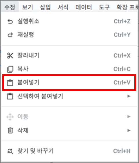 - 메뉴에서 수정 → 붙여넣기를 클릭하거나, 마우스 오른쪽 버튼을 클릭해 붙여넣기를 선택할 수 있습니다.