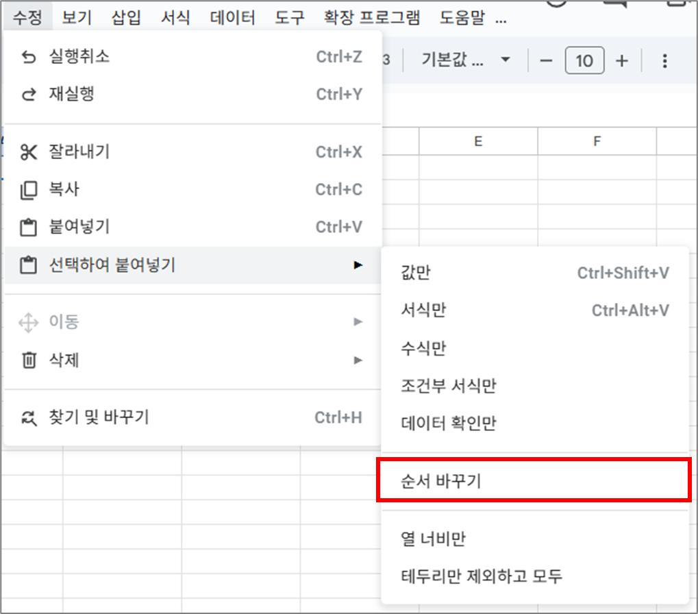 - 상단 메뉴 수정 → 선택하여 붙여넣기 → 순서 바꾸기 선택