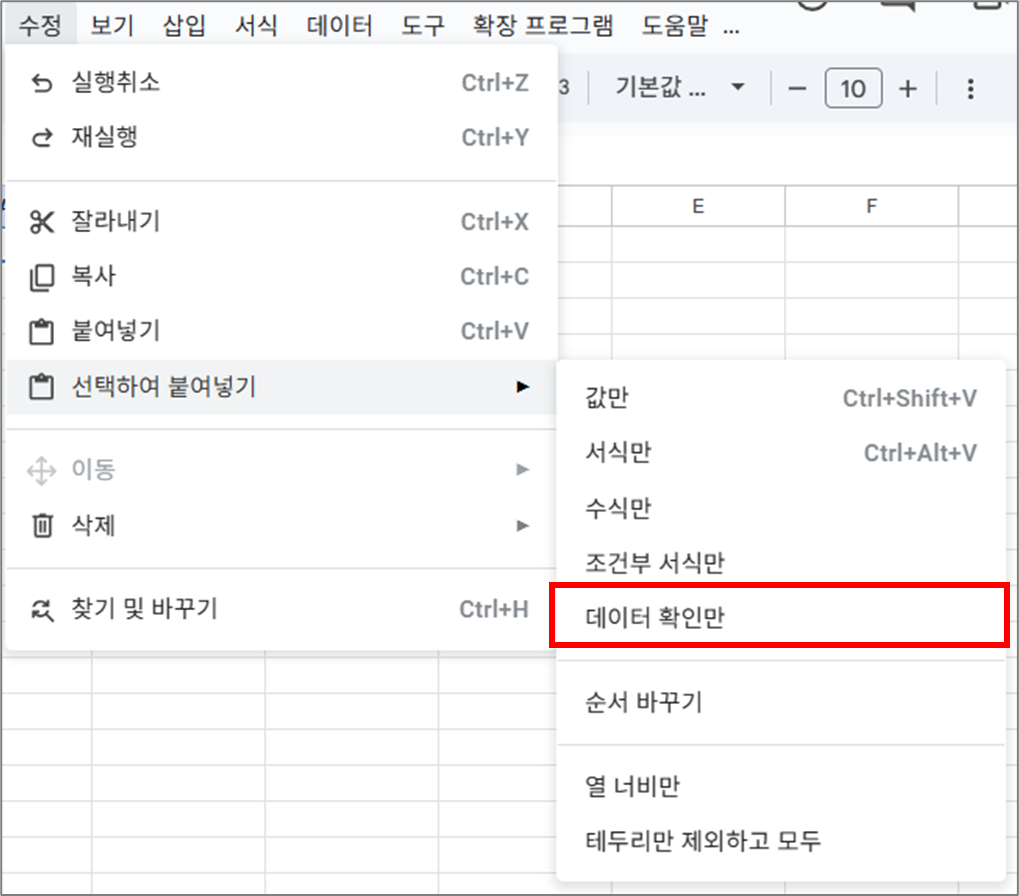 - 상단 메뉴 수정 → 선택하여 붙여넣기 → 데이터 확인만 붙여넣기 선택