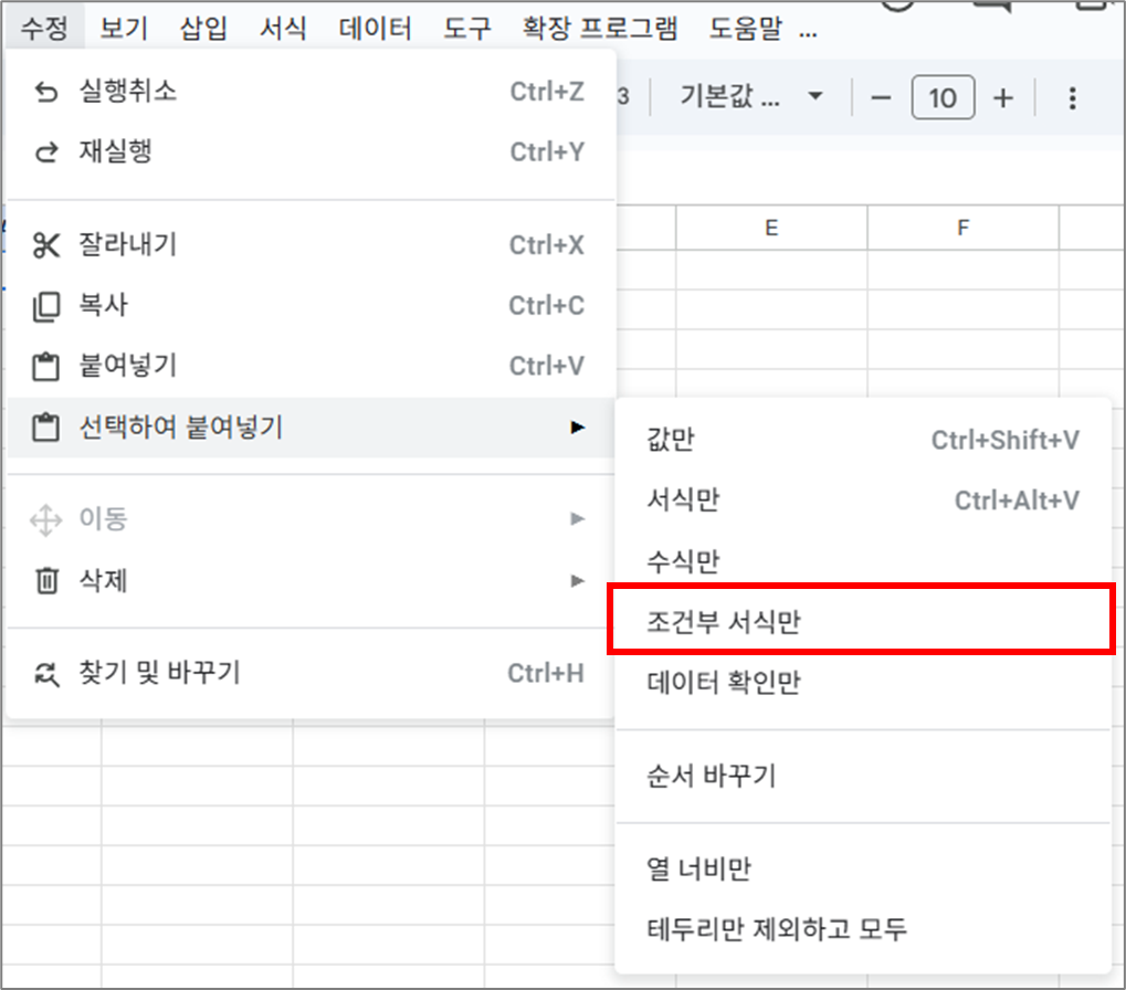 - 상단 메뉴 수정 → 선택하여 붙여넣기 → 조건부 서식만 붙여넣기 선택
