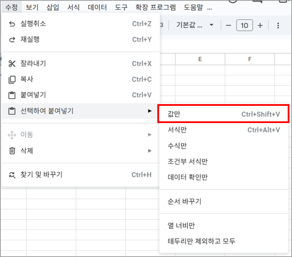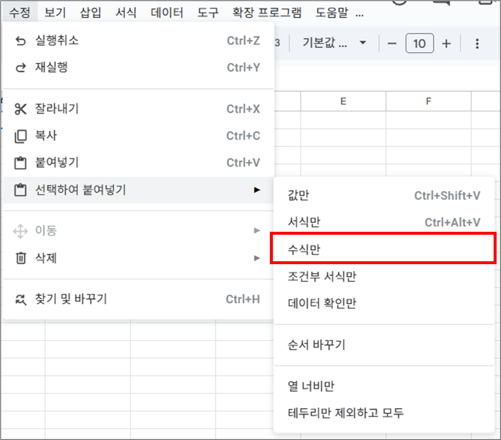 - 상단 메뉴 수정 → 선택하여 붙여넣기 → 수식만 붙여넣기 클릭